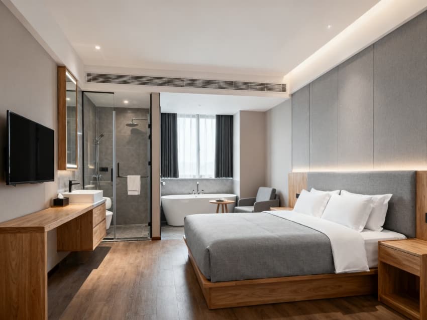 內部設計緊扣“多層功能適配”需求:1-2層為公共服務層(約1600㎡),1層布局前臺、大堂吧與全日制餐廳,淺灰大理石地面搭配木色軟裝,營造溫馨接待氛圍;2層設會議室、健身房與自助洗衣房,滿足商務與日常需求,空間以通透玻璃隔斷劃分,增強視覺延伸感。3-5層為核心住宿層(約2400㎡),規(guī)劃標準間、大床房與家庭房,淺木色地板搭配米白軟裝,嵌入式收納設計節(jié)省空間,每間客房配備智能控制系統(tǒng),提升居住舒適度。6層為配套休閑層(約800㎡),設屋頂露臺與小型茶室,鋪防腐木地面搭配藤編家具,可俯瞰周邊景觀,為客戶提供放松空間。?