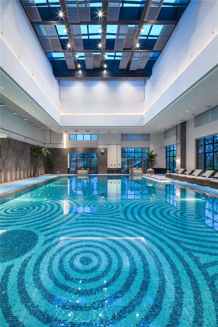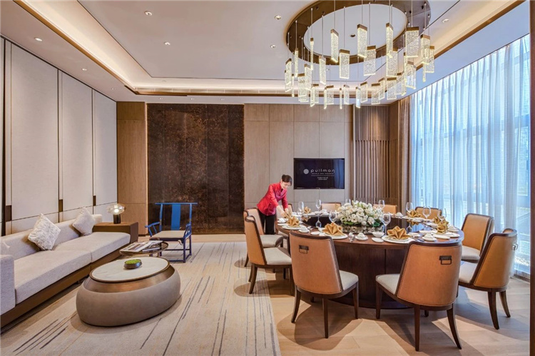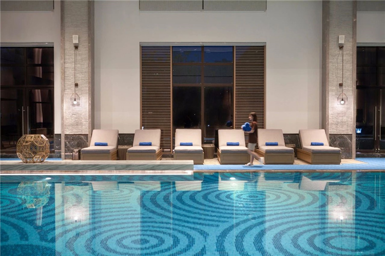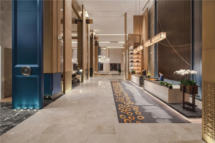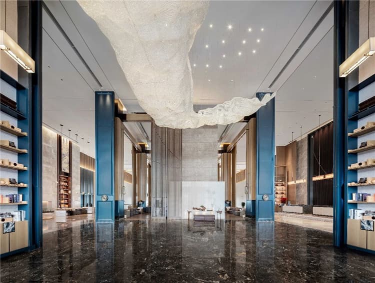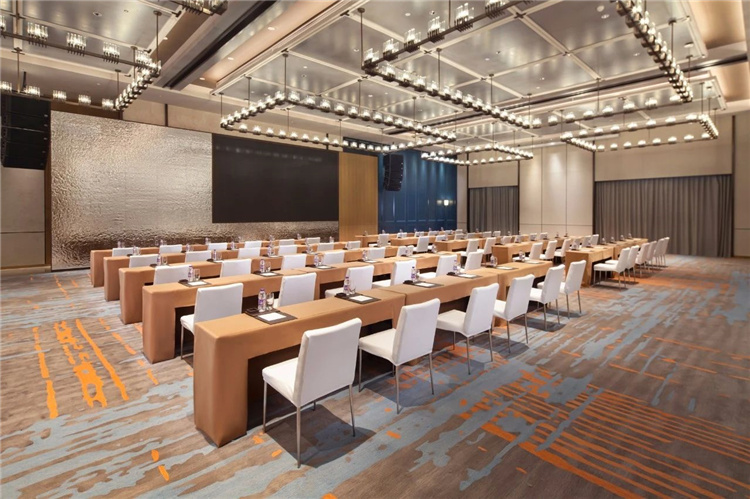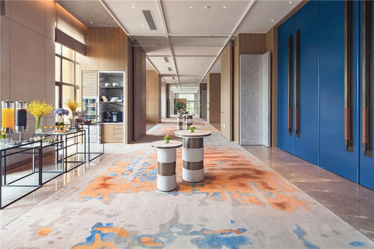 推開宴會廳蔚藍(lán)的大門,斑駁的地毯圖案像一副水底地形圖,鋪展開來,遼闊而又深邃神秘。宴會上空設(shè)計的片狀組合吊燈,似片片魚鱗,又似飛舞的花瓣,更似追逐游弋的魚群,輕盈、華美的形態(tài)讓這一方世界也變得靈動自然、生機(jī)勃勃。