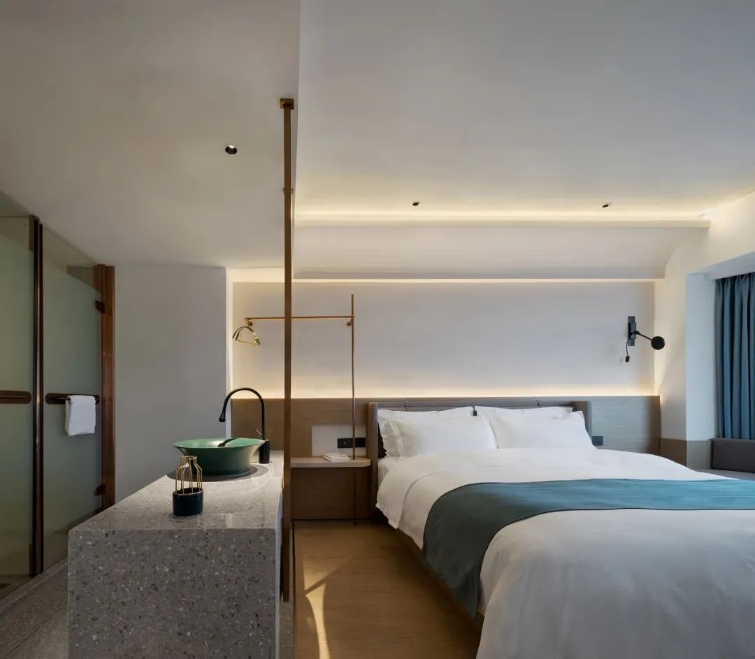在線條曲度與建筑結(jié)構(gòu)的銜接中交融出感性層面的驚喜,令入住者“循著光”下榻酒店,在體驗(yàn)與感受中為空間注入當(dāng)下的即時(shí)形態(tài),由此,人在空間里是造訪者亦是著境者,是觀賞者,亦是參與者。情與境中,無盡遐思。