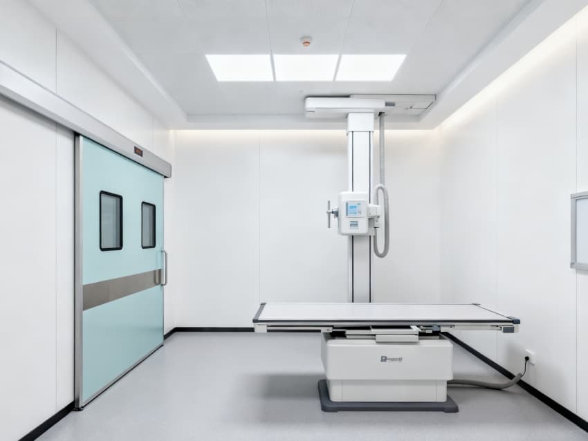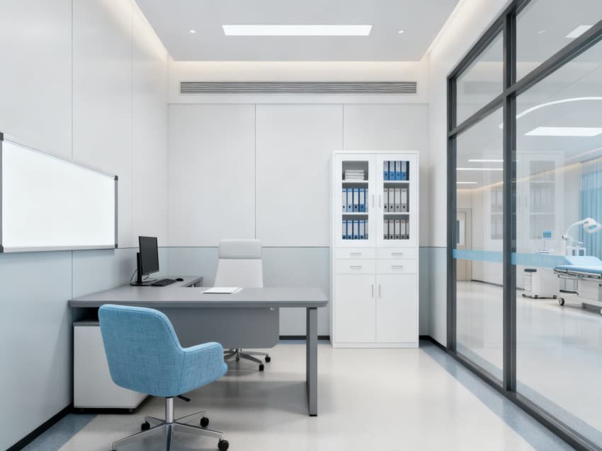 內(nèi)部空間延續(xù)外立面調(diào)性:診療區(qū)用淺灰色防靜電地板與白色無(wú)菌吊頂,模塊化診療臺(tái)搭配淺藍(lán)醫(yī)用軟包,兼顧操作便捷與患者舒適;候診區(qū)以淺灰布藝沙發(fā)搭配白色茶幾,綠植與暖光臺(tái)燈緩解等待焦慮;消毒室采用淺灰不銹鋼柜體與白色墻面,分區(qū)收納保障無(wú)菌標(biāo)準(zhǔn);咨詢室用淺木色桌椅搭配淺灰墻面,營(yíng)造溫和溝通氛圍;走廊鋪淺灰防滑地磚與米白墻面,線性燈帶與清晰導(dǎo)視提升通行效率。整體通過(guò)材質(zhì)、功能的協(xié)調(diào),打造專業(yè)且舒適的診療環(huán)境。