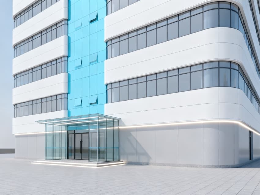 該口腔醫(yī)院以現(xiàn)代簡(jiǎn)約醫(yī)療風(fēng)格為核心,設(shè)計(jì)兼顧醫(yī)療專業(yè)性與患者舒適度,風(fēng)格統(tǒng)一且適配診療場(chǎng)景。外立面采用淺米白色抗菌涂料與超白鋼化玻璃組合,橫向淺灰色金屬線條分割立面,既保障建筑潔凈易打理,又通過(guò)低飽和色彩緩解患者緊張感;入口設(shè)淺灰色石材地面與玻璃感應(yīng)門(mén),搭配嵌入式導(dǎo)視燈箱,清晰引導(dǎo)且顯專業(yè)。?