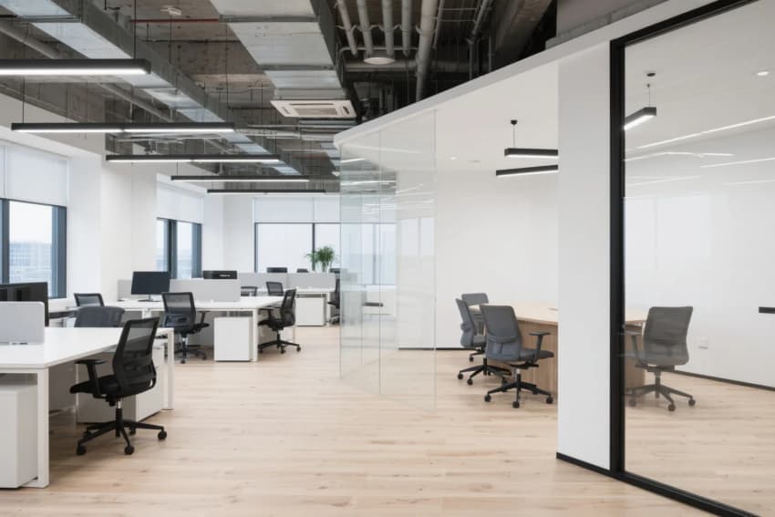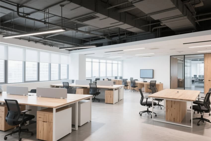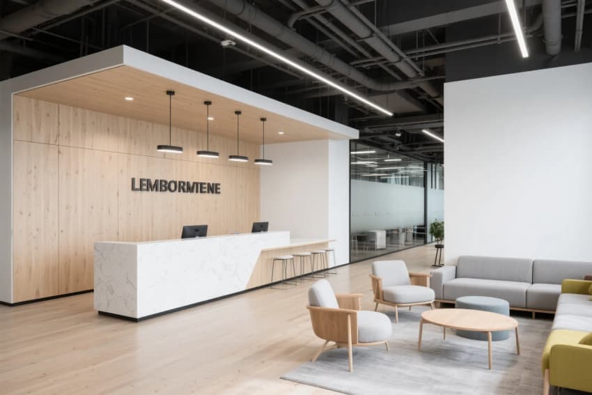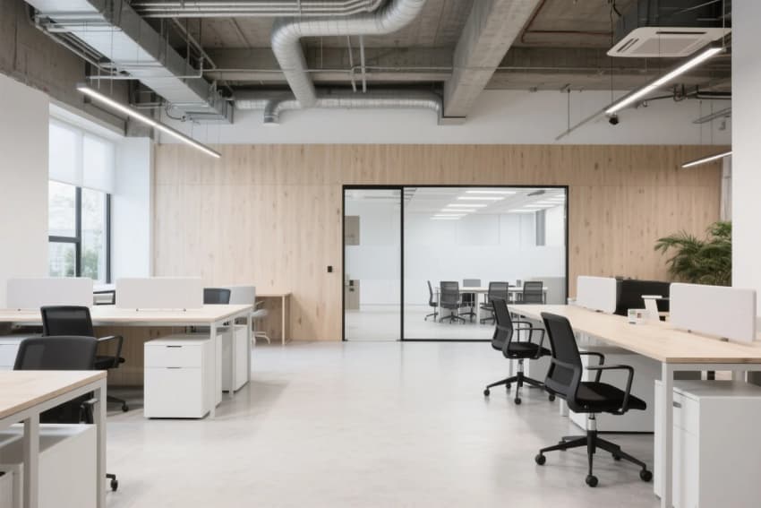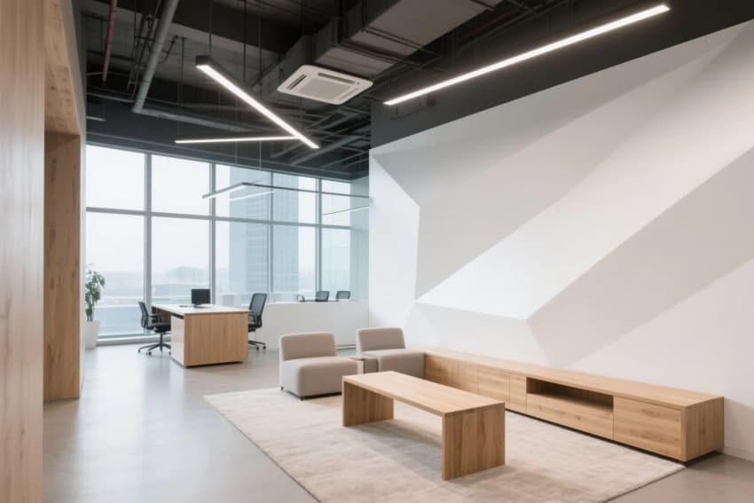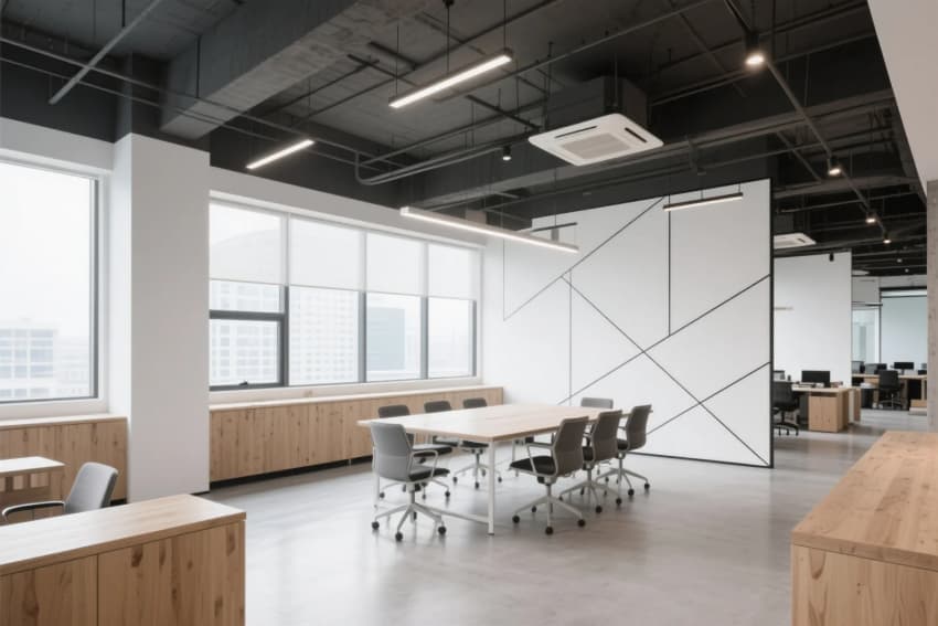 工業(yè)風辦公樓設(shè)計,以淺木色橡木地板與白色肌理墻面奠定純凈基調(diào),8米挑高的接待區(qū)采用裸露的鋼結(jié)構(gòu)橫梁,搭配線性垂吊燈具形成幾何構(gòu)圖。開放式辦公區(qū)通過白色穿孔金屬隔斷劃分工位,淺木色集成儲物柜與黑色金屬框架形成材質(zhì)碰撞。休閑區(qū)設(shè)置灰綠色模塊沙發(fā)組合,上方懸挑的木質(zhì)格柵吊頂內(nèi)置暖光漫射光源,與保留的原始混凝土立柱形成冷暖平衡。獨立會議室采用全景霧化玻璃隔斷,內(nèi)部定制白色會議桌搭配黑色工業(yè)風軌道射燈,墻面裝飾的抽象線條實木拼貼呼應(yīng)整體設(shè)計語言。各功能區(qū)域通過地面材質(zhì)的漸變過渡自然銜接,裸露的通風管道與精心設(shè)計的綠植墻共構(gòu)出生機盎然的工業(yè)美學(xué)。