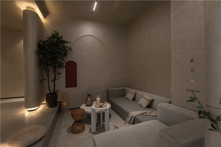 休息區(qū),水泥灰的簡練基調(diào),能讓客人感受到時間的靜謐,在短暫的停留里更有一番耐心來感受美的沉淀與力量??腿丝梢栽谶@里一邊小小地等候,一邊飲茶。茶香飄逸,能彌漫空氣當(dāng)中,散落在這個侘寂空間的每一個角落。延續(xù)了前廳的鏤空墻面設(shè)計,內(nèi)外形成空間對話,虛實結(jié)合,光影靈動,給予了客人一種仿若置身在山林間,回歸自然般的愜意。
