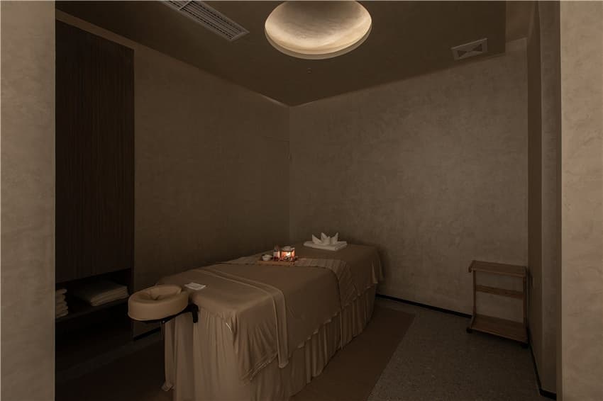 VIP理療室由單獨的SPA床位和獨立的空間設(shè)備構(gòu)成,是VIP會員享有的專人服務(wù)、更為高級、貼心的靜享體驗。天花圓頂呼應(yīng)整體的視覺氛圍,結(jié)合漫反射的燈光設(shè)計,讓客人在此慢下來,享受一次回歸自然的身心養(yǎng)護。