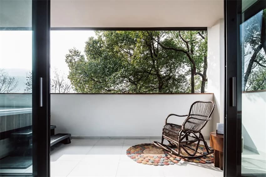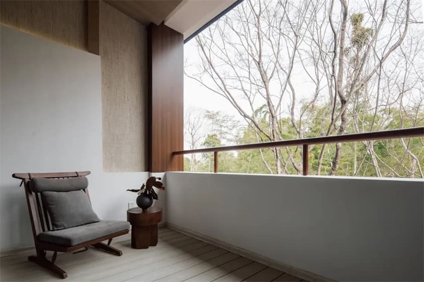 另外,也把每個(gè)客房都讓出一個(gè)足夠深的陽臺(tái),使得客人可以在陽臺(tái)上泡澡,喝茶,近距離地感受樹木,陽光和空氣。