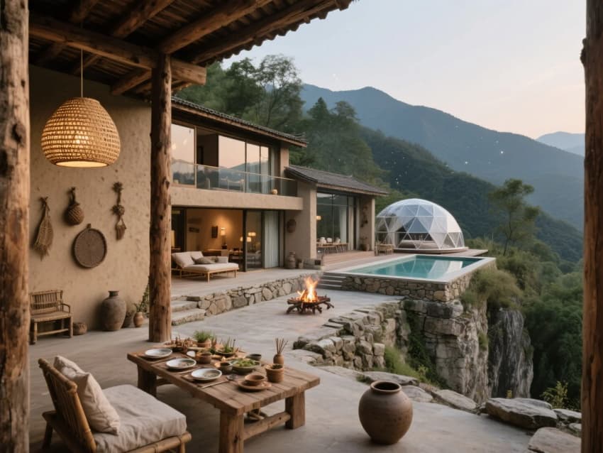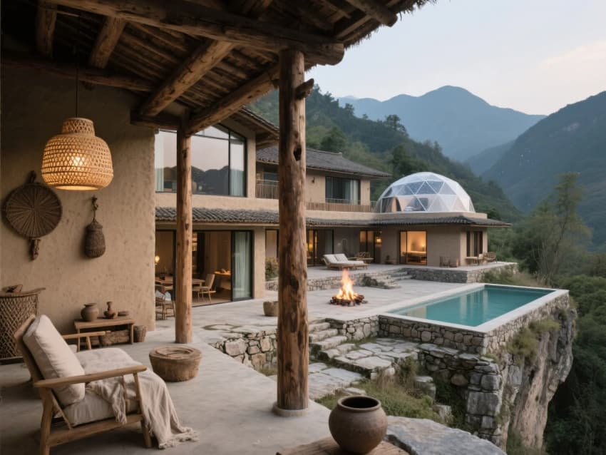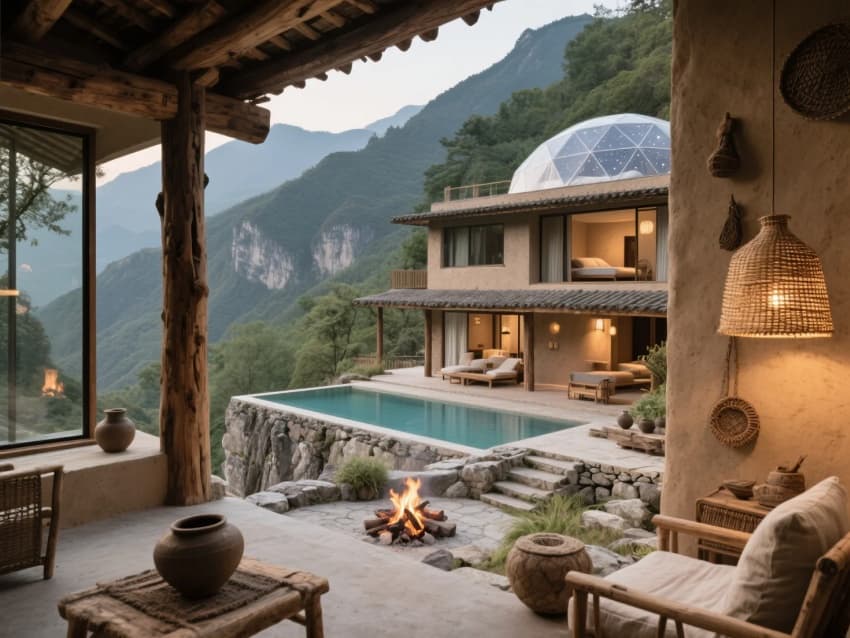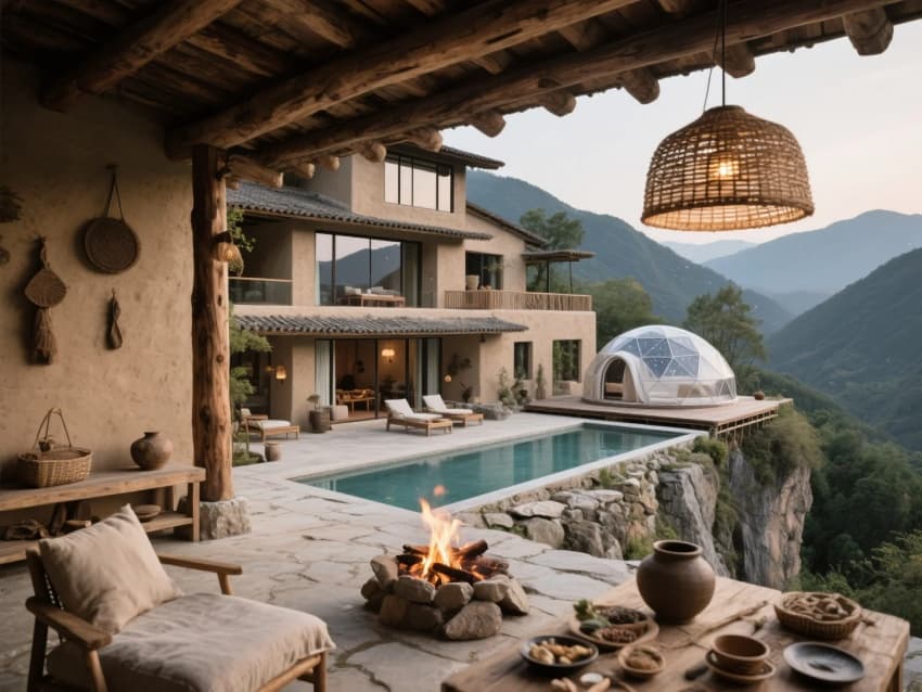 建筑形態(tài):錯(cuò)落層疊的夯土院落,保留原始石墻與木質(zhì)結(jié)構(gòu),搭配全景落地窗引入山景。