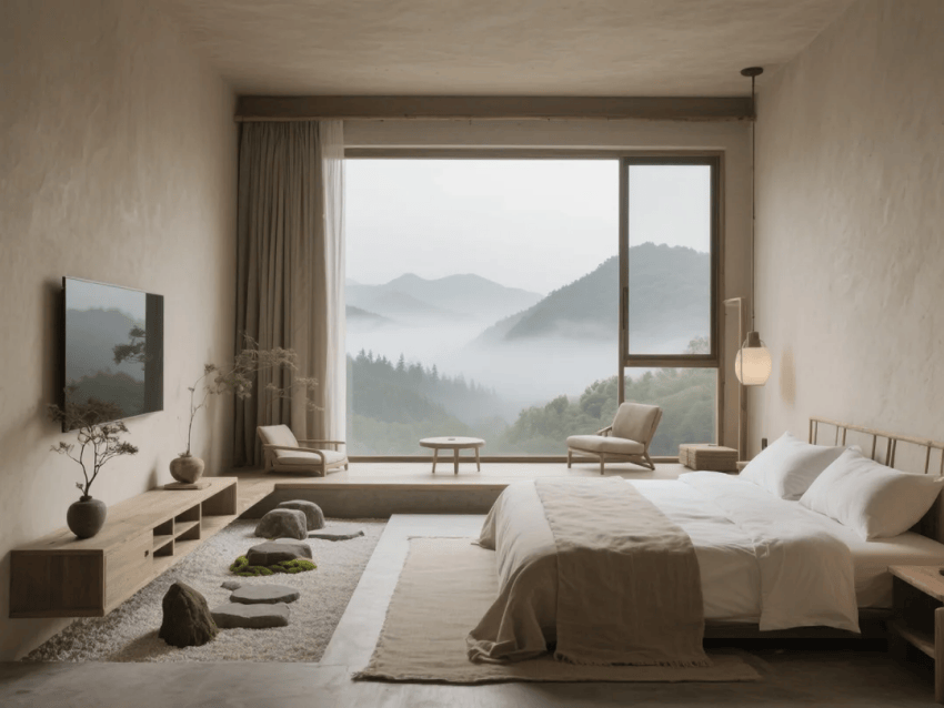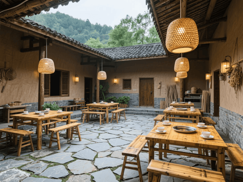 色彩系統(tǒng)提取大地色系為基底,朱砂紅、靛藍等傳統(tǒng)色點睛。功能設計強調(diào)沉浸體驗:客房內(nèi)置方言語音系統(tǒng),餐廳提供灶火烹飪教學,庭院夜觀星象活動??沙掷m(xù)細節(jié)貫穿始終:雨水回收系統(tǒng)灌溉菜園,廢棄農(nóng)具再造為藝術裝置,最終打造一個有溫度、可參與、能帶走的文化記憶容器。