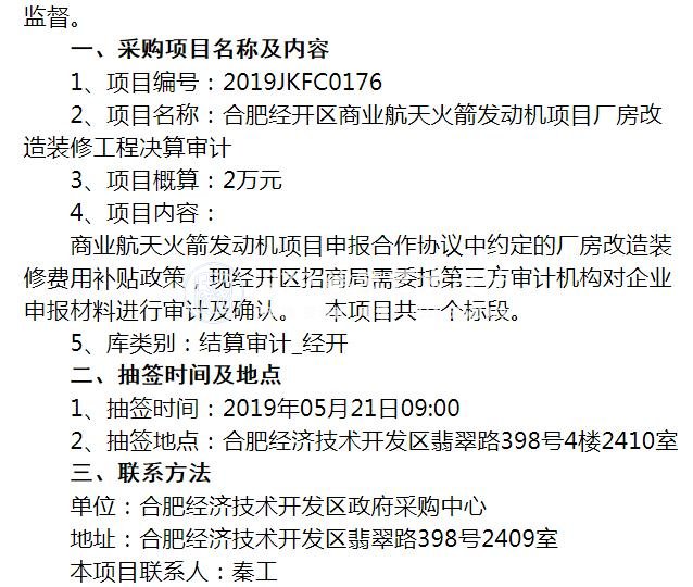 合肥經(jīng)濟技術(shù)開發(fā)區(qū)政府采購中心受合肥經(jīng)濟技術(shù)開發(fā)區(qū)招商局的委托,現(xiàn)對“合肥經(jīng)開區(qū)商業(yè)航天火箭發(fā)動機項目廠房改造裝修工程決算審計項目”進行公告,歡迎入庫定點單位到現(xiàn)場監(jiān)督。
