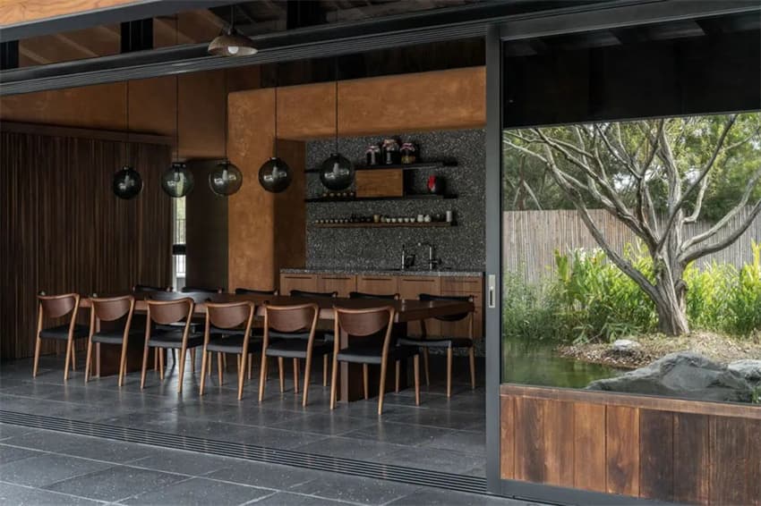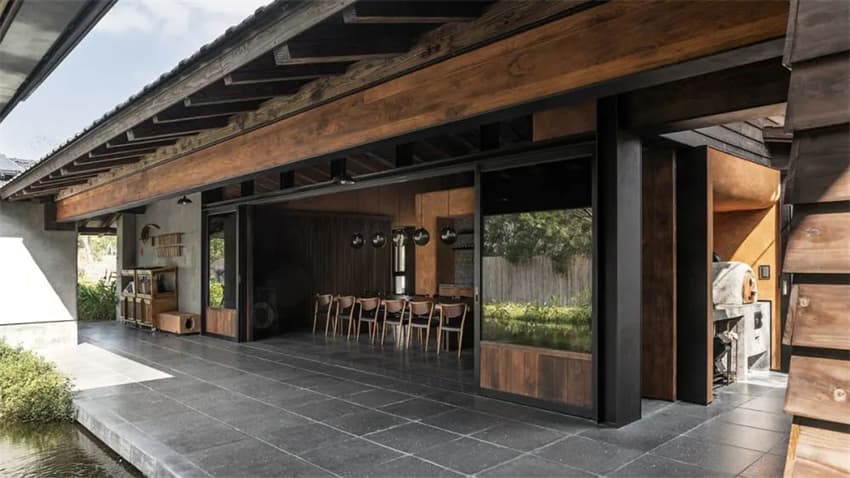 設(shè)計(jì)從場(chǎng)地出發(fā),重新組織溪水、省道、院落和建筑之間的關(guān)系,創(chuàng)造有敘事感的空間序列。將分散的廊道整合成為一個(gè)近30m長的厚度界面,這個(gè)界面的兩端同時(shí)還容納了一個(gè)接待室和一個(gè)長亭,將外部省道的嘈雜喧鬧有效地隔絕,內(nèi)部獨(dú)立的空間氛圍也得以營造。從省道進(jìn)入大堂的流線被拉長,多次轉(zhuǎn)折以獲得更多的時(shí)空距離與多角度的前導(dǎo)景觀序列。這個(gè)江南園林般的隱秘入口強(qiáng)化了內(nèi)部世界的寧靜與避世感。