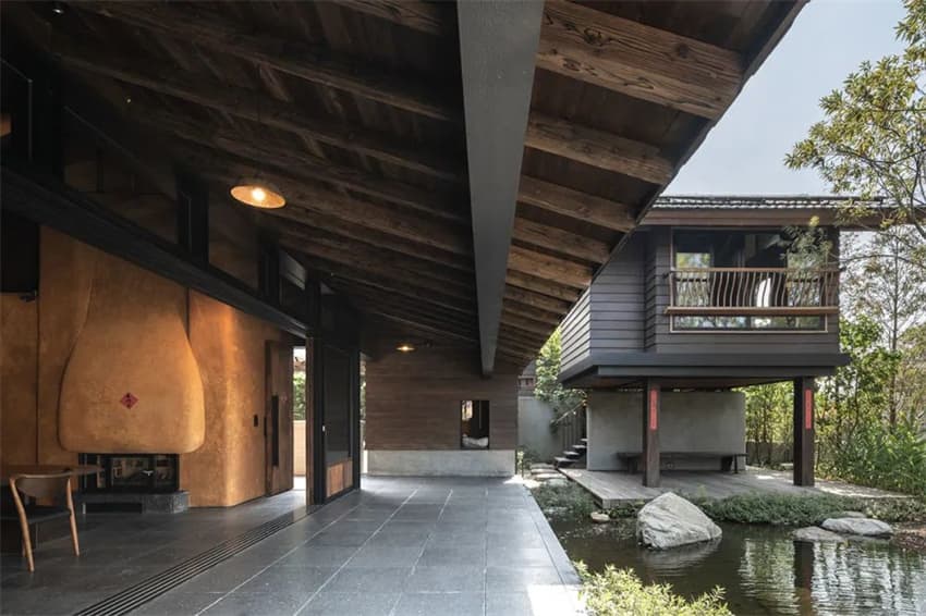主體建筑正面的場(chǎng)地內(nèi)院設(shè)置為淺倒影池,并由水邊兩側(cè)連續(xù)的廊道與石塊片墻圍合,從主體建筑正面的檐下空間出來,在廊道中無法看見主體建筑的全貌。只有走到端頭的篝火平臺(tái)上回看,才能看到完整的主體建筑立面。四層樓的高大尺度也因?yàn)樗娓糸_的距離而顯得與背后的山體輪廓更和諧。動(dòng)態(tài)活動(dòng)區(qū)設(shè)置在廊外側(cè)的山腳臺(tái)地之上,燒烤區(qū)和溫泉區(qū)由下及上分布在多個(gè)臺(tái)地中。這樣動(dòng)靜分區(qū),使正對(duì)水面的客房擁有了靜謐的山居體驗(yàn),不大的場(chǎng)地也因水面反射天空而被無限擴(kuò)展。