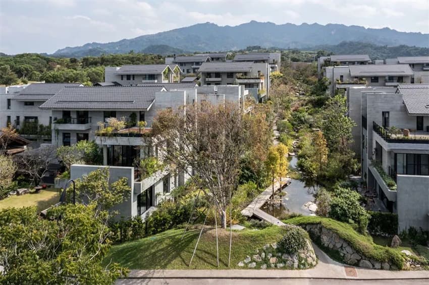 坐落于臨安太湖源溪邊,被省道和山坡圍合的小塊山間平地上,場(chǎng)地高于省道近3m,有臺(tái)階從省道邊直接沖上場(chǎng)地,沿高差處有分散的木廊道。之前主體為4層高的巨大仿古建筑,內(nèi)設(shè)30間客房。業(yè)主希望減少客房數(shù)量,提升居住的空間體驗(yàn)。