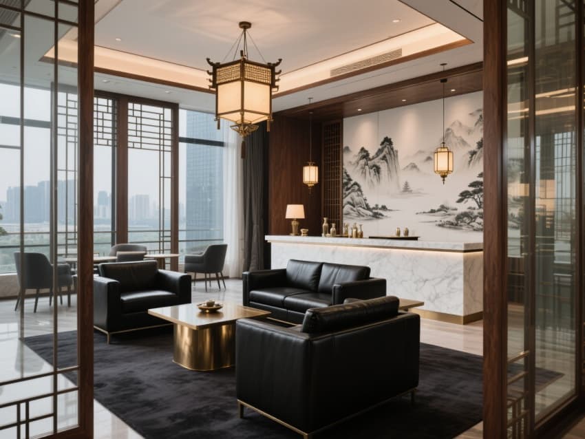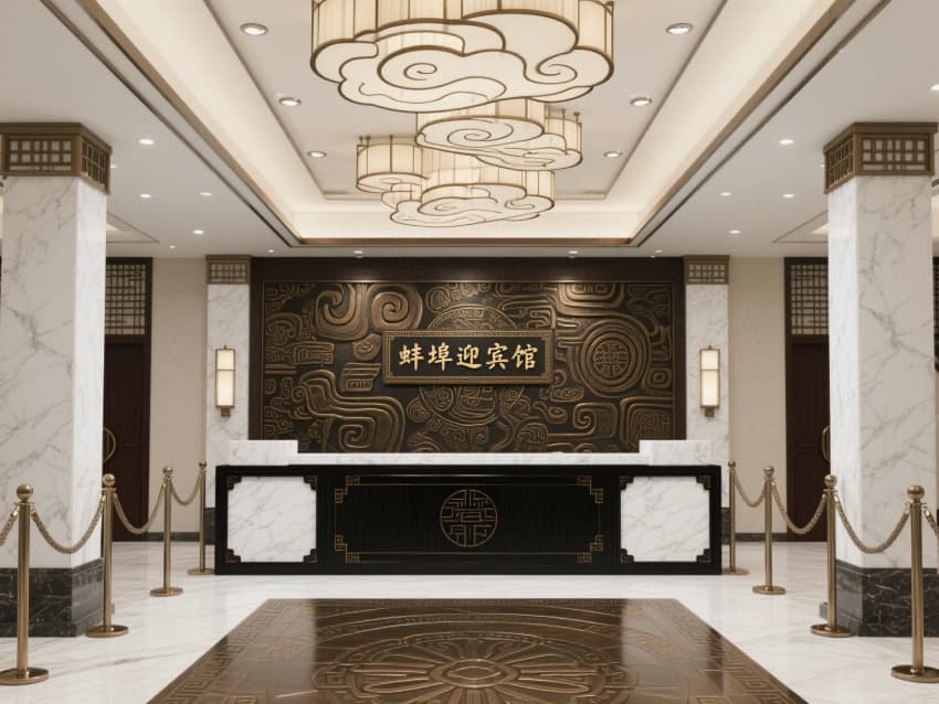 •     該蚌埠酒店是一座將新中式典雅與現(xiàn)代奢華完美融合的高端酒店。大堂以大理石立柱、祥云造型吊燈與銅制浮雕背景墻構(gòu)成恢宏氣場(chǎng),“蚌埠迎賓館”的牌匾盡顯地域文化底蘊(yùn)。