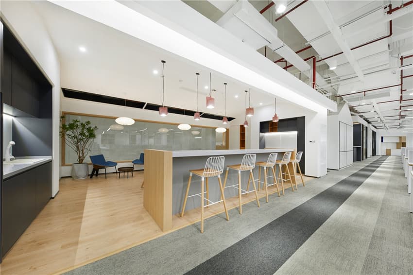 工位數(shù)量需求雖然龐大,但甲方對多元化的功能區(qū)的需求并未減少。于是我們將咖啡吧、茶水間、休閑區(qū)這幾個(gè)功能進(jìn)行融合,破除了空間的界定,將水吧區(qū)打造成一個(gè)開放性的多功能區(qū)域,賦予它全新定義,從而達(dá)到滿足員工的一系列休閑目的。