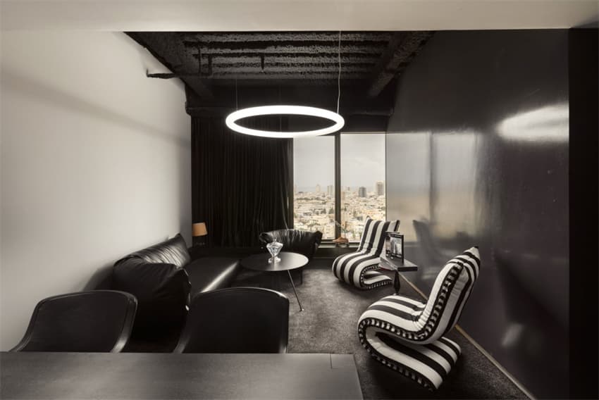 盒子面向“起居室”,這是一個(gè)開(kāi)放空間,有各種座位,一個(gè)活躍的酒吧作為辦公室的中心。