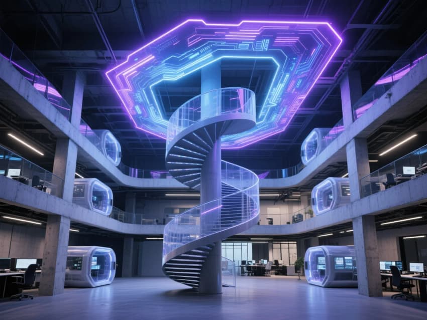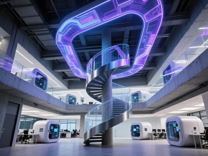 互聯(lián)網(wǎng)巨頭的總部辦公空間宛若未來科技的烏托邦,一座懸浮的螺旋樓梯如DNA雙鏈般盤旋而上,將三層空間編織成有機(jī)整體。透明如水晶的編程艙錯落其間,仿佛漂浮在空中的思維容器,程序員們?nèi)缤蒙碛跀?shù)字海洋中的潛水員。天花板上流動的動態(tài)光效數(shù)據(jù)流,宛如銀河傾瀉而下,將整個空間籠罩在賽博朋克的藍(lán)紫色光暈中。極簡的工業(yè)風(fēng)骨架下,混凝土的粗獷質(zhì)感與陽極氧化鋁的冷冽光澤形成強(qiáng)烈對比,參數(shù)化設(shè)計的結(jié)構(gòu)線條如同未來城市的微縮景觀,在虛實之間勾勒出數(shù)字時代的建筑詩篇。