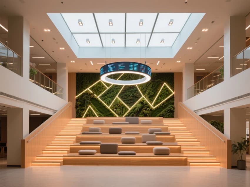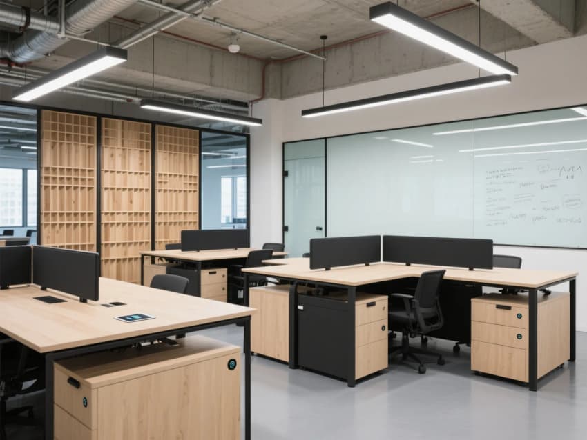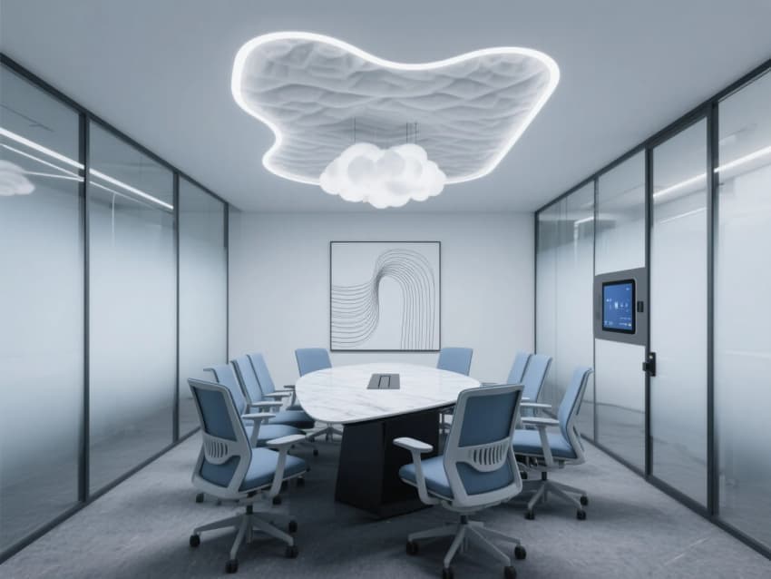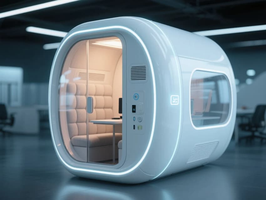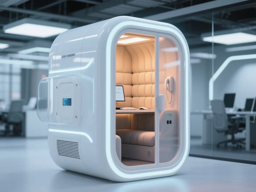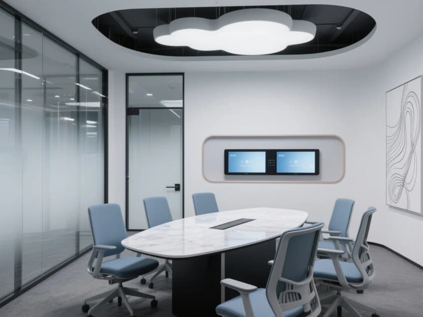 未來主義辦公風(fēng)格;辦公區(qū)以模塊化升降辦公桌組合,淺木色桌面+黑色鋼架結(jié)構(gòu);階梯式多功能共享空間,搭配可移動(dòng)軟墊座椅。極簡玻璃盒子會(huì)議室,霧化玻璃隔斷+隱藏式門框,內(nèi)置嵌入式觸控屏。會(huì)議桌為異形巖板臺(tái)面,搭配灰藍(lán)色人體工學(xué)椅。太空艙式獨(dú)立電話亭,白色玻璃纖維外殼+內(nèi)部吸音棉,配備通風(fēng)系統(tǒng)與USB接口,科技私密感十足。