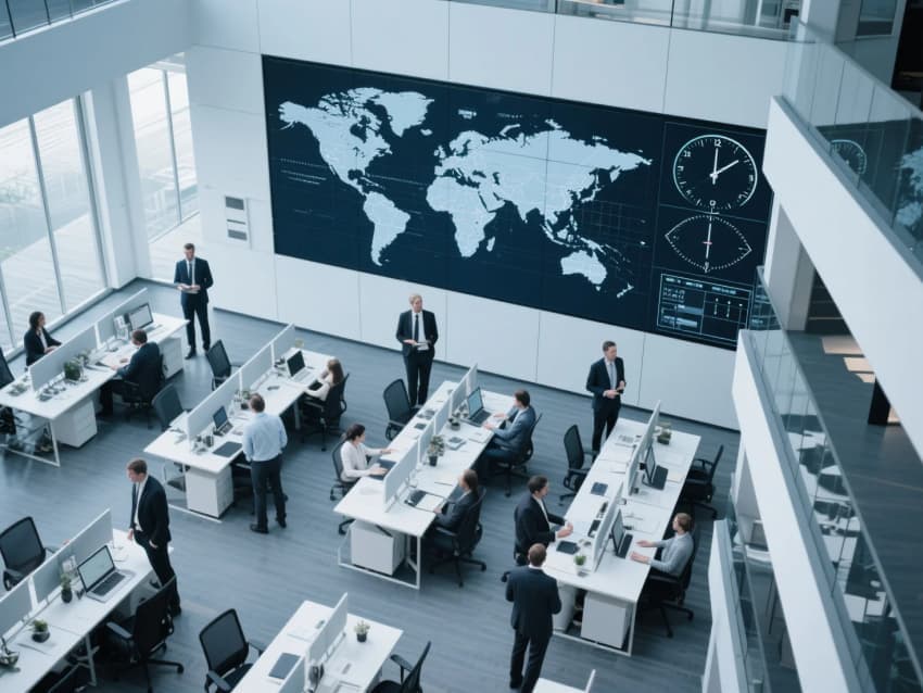 本案以"全球貿(mào)易樞紐"為設(shè)計(jì)概念,融合國際商務(wù)氣質(zhì)與數(shù)字科技體驗(yàn)??臻g采用深海藍(lán)象征貿(mào)易航線,香檳金點(diǎn)綴企業(yè)質(zhì)感,通過曲面LED與智能玻璃構(gòu)建數(shù)字化界面。核心區(qū)域植入"地球村"元素:大堂設(shè)置多時(shí)區(qū)時(shí)鐘墻,走廊變身貨輪集裝箱藝術(shù)展,咖啡區(qū)配備多國插座系統(tǒng)。