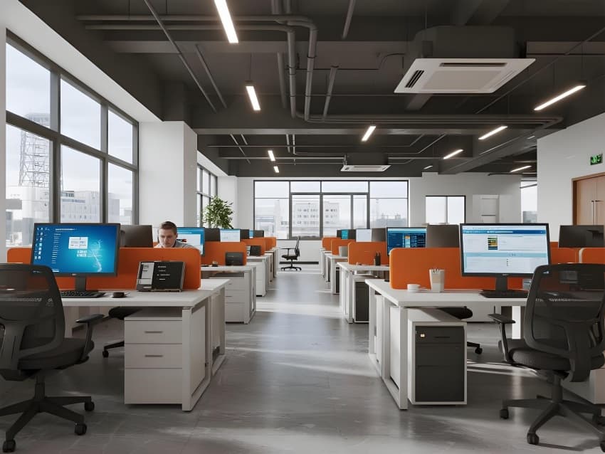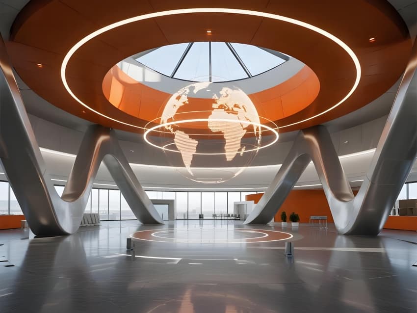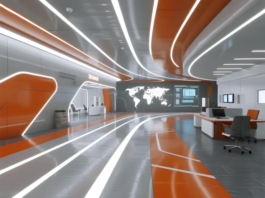 本案以"世界物流神經中樞"為設計概念,打造彰顯行業(yè)特性的科技地標??臻g采用工業(yè)美學語言,主色調演繹物流活力:金屬銀象征基礎設施,企業(yè)橙代表能量流動,數據藍勾勒信息脈絡。核心區(qū)域重構工作場景:大廳變身實時物流沙盤,調度中心配置三維路由系統(tǒng),展示區(qū)運行真實分揀演示。