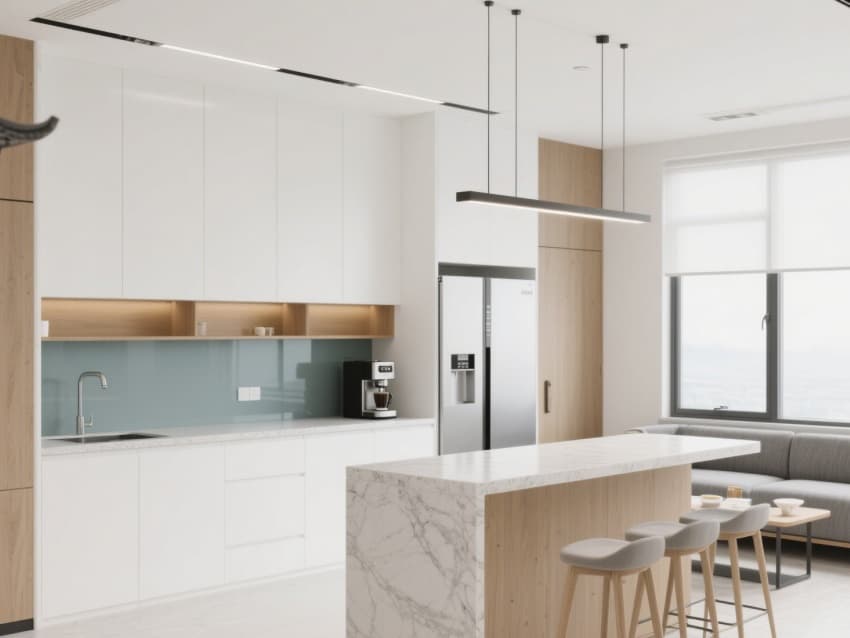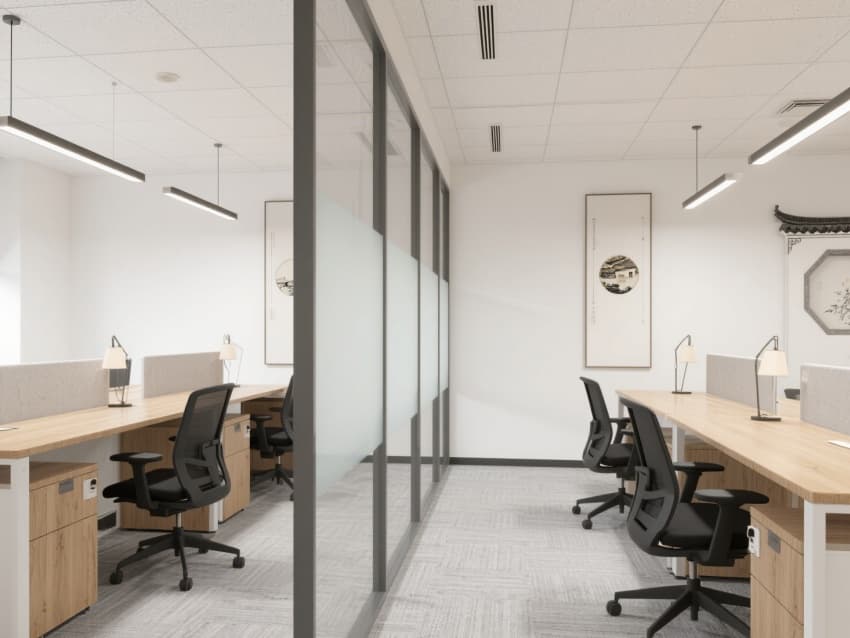 各區(qū)域以黛青色金屬收邊與原木元素串聯(lián),茶水間用徽州石雕紋樣的瓷磚,走廊掛水墨風(fēng)格合肥地標(biāo)裝飾畫。既滿足現(xiàn)代辦公功能,又借徽派元素凸顯地域?qū)傩?,打造有文化記憶點(diǎn)的合肥企業(yè)辦公場景。