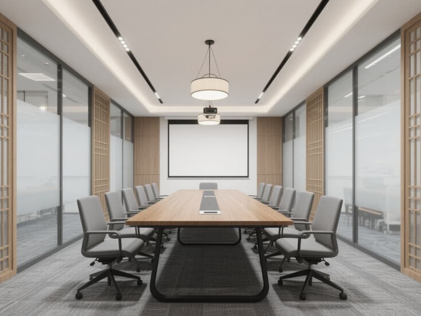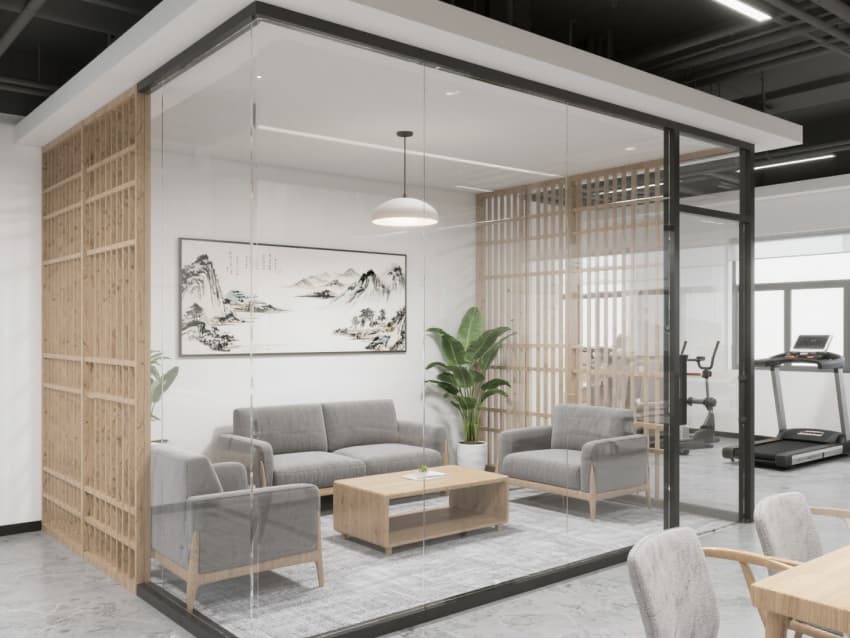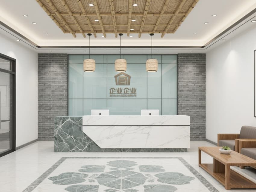 一層接待區(qū)設(shè)黛青邊框玻璃屏風(fēng),嵌簡化馬頭墻紋樣;二層辦公區(qū)用原木模塊工位,天花懸仿徽派天井的線性燈;三層會議室墻面覆仿青磚肌理涂料,配實(shí)木會議桌,角落擺徽州竹編裝飾。?
