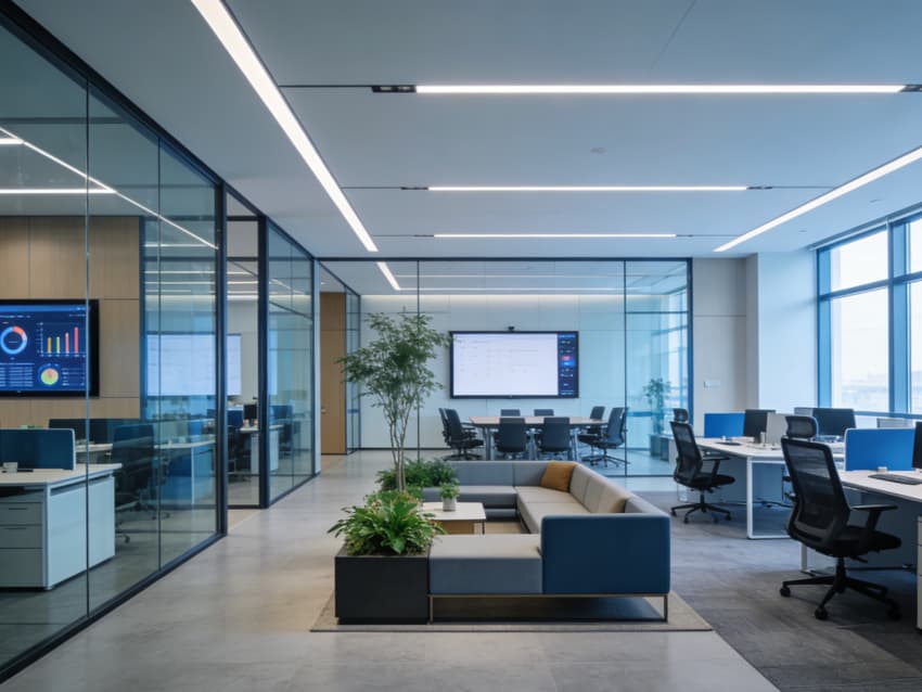 極簡現(xiàn)代風(fēng)格,以黑白灰為基底,搭配淺木色與科技藍(lán)作為點綴,營造出理性、高效的科研氛圍。開放辦公區(qū)采用模塊化工位布局,搭配人體工學(xué)座椅與雙屏顯示器,滿足研發(fā)人員長時間專注工作的需求;頂面線性燈帶與嵌入式筒燈形成層次分明的照明系統(tǒng),既保障工作照度,又通過無主燈設(shè)計強(qiáng)化空間的縱深感。