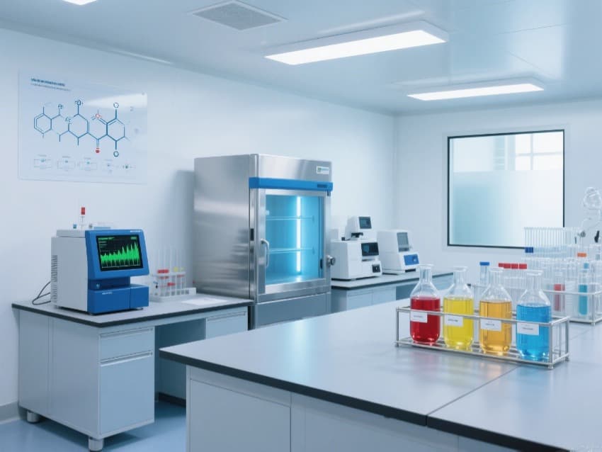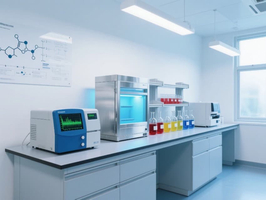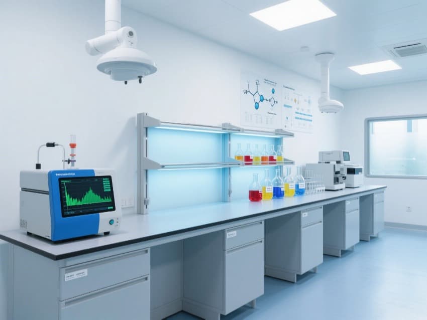 墻壁上掛有幾張展示化學(xué)結(jié)構(gòu)和實(shí)驗(yàn)流程的海報(bào),這表明該實(shí)驗(yàn)室可能主要進(jìn)行化學(xué)相關(guān)的研究或測(cè)試工作。此外,實(shí)驗(yàn)室還設(shè)有多個(gè)通風(fēng)管道,確保實(shí)驗(yàn)過程中產(chǎn)生的有害氣體能夠及時(shí)排出,保障實(shí)驗(yàn)人員的安全。