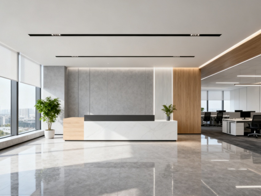 本4300㎡寫字樓設(shè)計以“現(xiàn)代簡約?高效通透”為核心,實現(xiàn)外立面與內(nèi)部空間的風(fēng)格統(tǒng)一與功能適配。外立面采用玻璃幕墻與淺灰色金屬線條結(jié)合,搭配大面積采光面,既彰顯商務(wù)質(zhì)感,又最大化引入自然光線,呼應(yīng)內(nèi)部通透設(shè)計理念。?