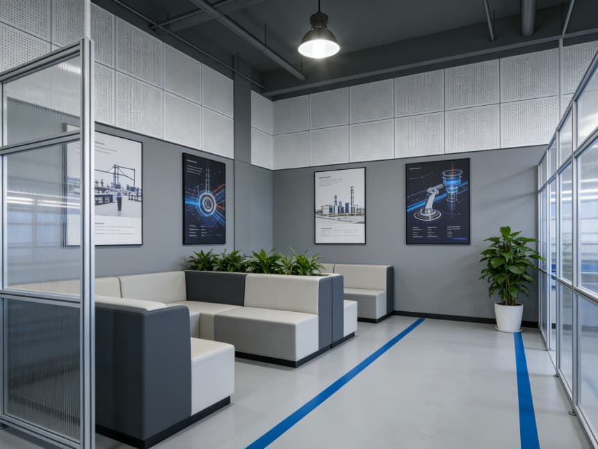 整體以工業(yè)灰為主色調(diào),搭配局部科技藍(lán)點綴,材質(zhì)選用耐磨耐腐蝕的工業(yè)板材、防滑地磚,墻面局部嵌入管線造型與配網(wǎng)技術(shù)圖譜裝飾。各空間通過簡潔隔斷自然銜接,動線規(guī)劃高效便捷,既保障生產(chǎn)研發(fā)的有序推進,又兼顧銷售洽談的商務(wù)格調(diào),實現(xiàn)工業(yè)實用屬性與現(xiàn)代設(shè)計美學(xué)的精準(zhǔn)融合。