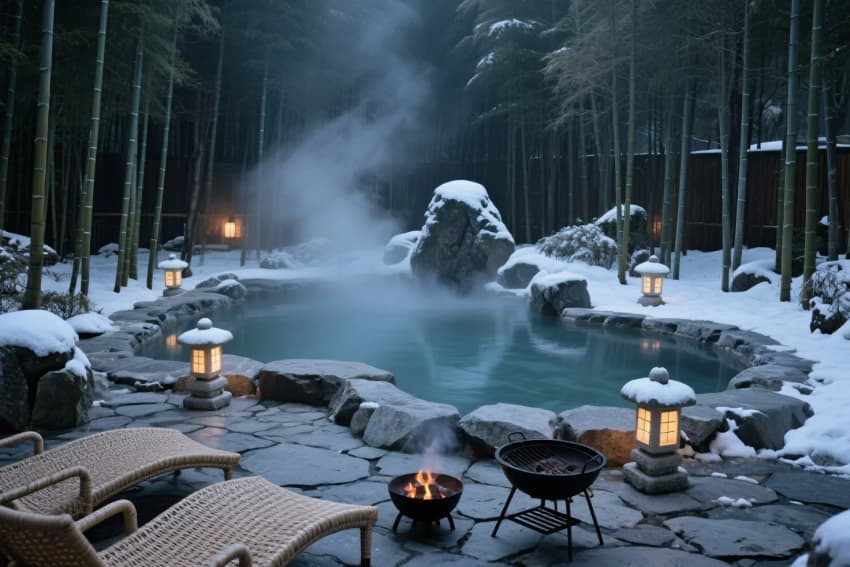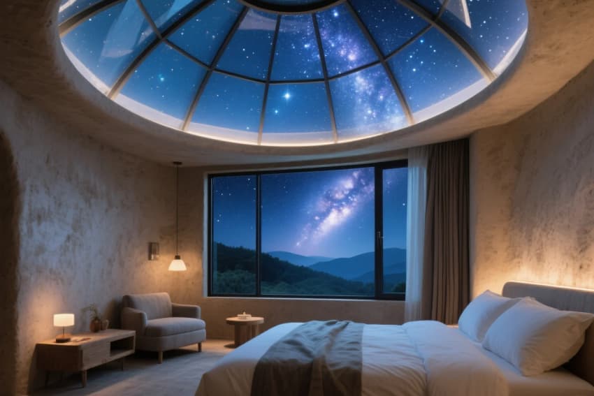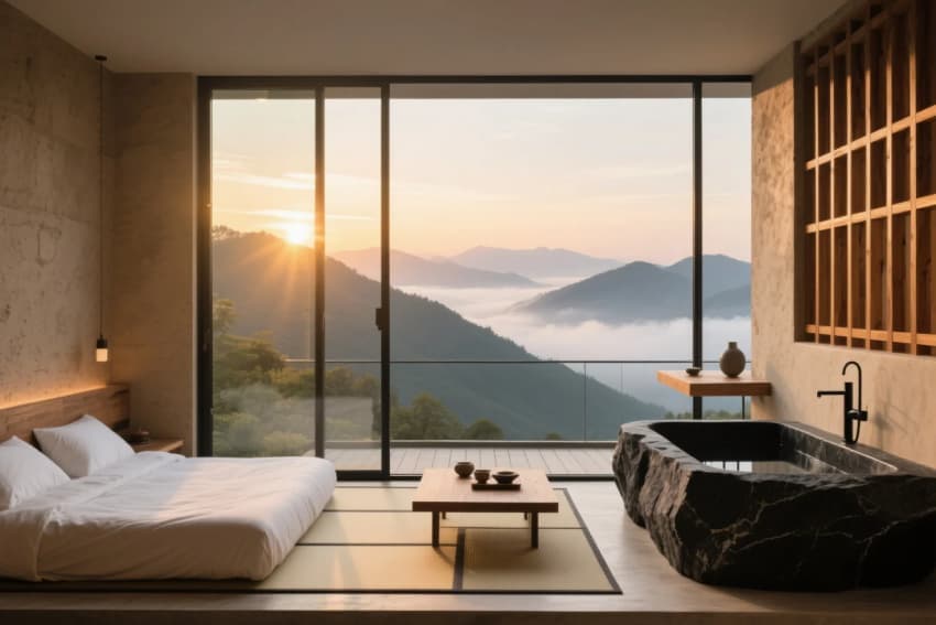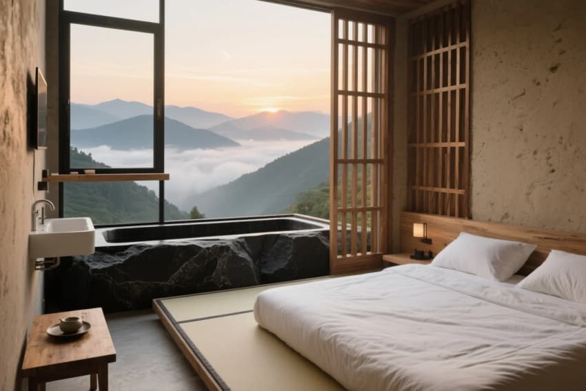 • 設(shè)計(jì)以"自然共生、質(zhì)樸療愈"為核心理念,打造隱逸于山林的靜謐居所。建筑采用夯土墻與原木結(jié)構(gòu)的在地化語(yǔ)言,錯(cuò)落式布局順應(yīng)山地地形。公區(qū)以懸挑茶室與枯山水庭院為核心,客房通過(guò)全景落地窗將四季山景引入室內(nèi)。材質(zhì)上強(qiáng)調(diào)手工質(zhì)感——老榆木梁柱、手工陶磚、亞麻簾幕,搭配地暖榻榻米與露天湯池。路徑設(shè)計(jì)蜿蜒曲折,石階兩側(cè)點(diǎn)綴苔蘚與石燈籠,夜間呈現(xiàn)"螢火蟲(chóng)小徑"的夢(mèng)幻效果。整體以不完美的自然肌理詮釋"寂之美",構(gòu)建可居可游的詩(shī)意棲居。