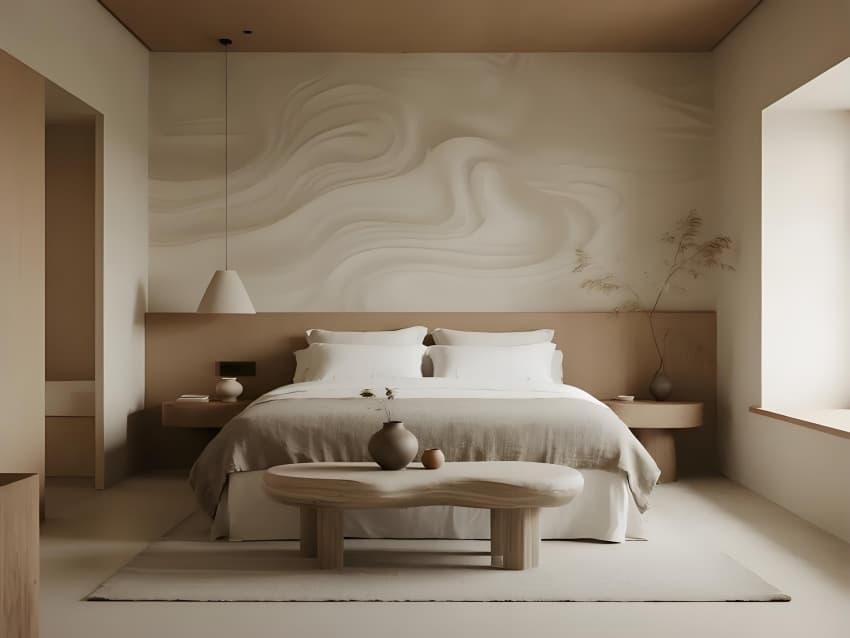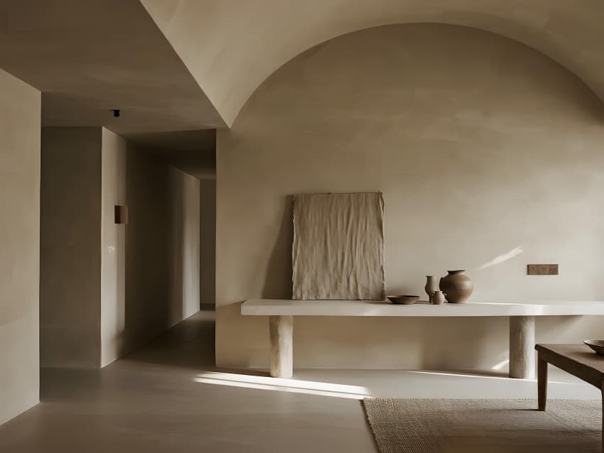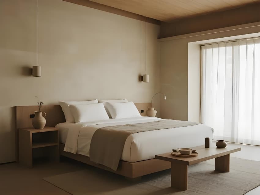 •     本案以"在地性的當(dāng)代轉(zhuǎn)譯"為設(shè)計(jì)核心,打造反標(biāo)準(zhǔn)化的現(xiàn)代民宿范本。建筑采用去裝飾化語(yǔ)言,保留原生地貌肌理,以懸浮體塊構(gòu)成空間序列。色彩系統(tǒng)提取自然色譜:晨曦灰、苔原綠、陶土橙,通過(guò)漸變釉面磚實(shí)現(xiàn)與環(huán)境的色彩滲透。