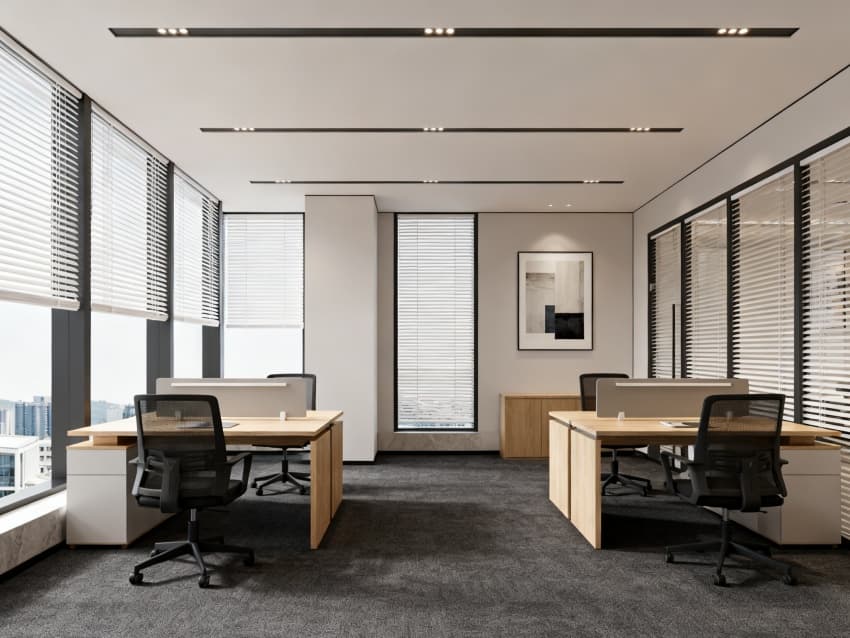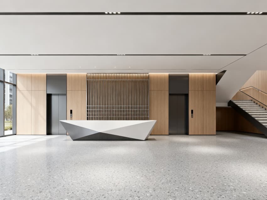 整體以淺灰、白色、淺木色為基調(diào),通過統(tǒng)一材質(zhì)(金屬線條、玻璃、石材)貫穿三層,避免空間割裂;同時融入適光設(shè)計與隱藏式收納,讓簡約風(fēng)格不流于單調(diào),實現(xiàn)“功能適配+視覺統(tǒng)一+體驗舒適”的辦公場景需求。