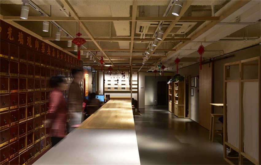 很難想象這樣的醫(yī)館竟坐落于CBD的寫字樓中。沒(méi)有自然光線反而更不會(huì)被外界所打擾。古香古色的木質(zhì)中藥柜,是從老店直接沿用過(guò)來(lái)的,與前面的水磨石長(zhǎng)調(diào)劑吧臺(tái)形成鮮明的對(duì)比。這種新與舊的“混淆感”似乎在這個(gè)空間里隨處可尋——上方裸露的工業(yè)化管道,與不乏傳統(tǒng)印痕的家具陳設(shè)共成一體。這一切都映射出品牌理念所蘊(yùn)含的東方智慧。