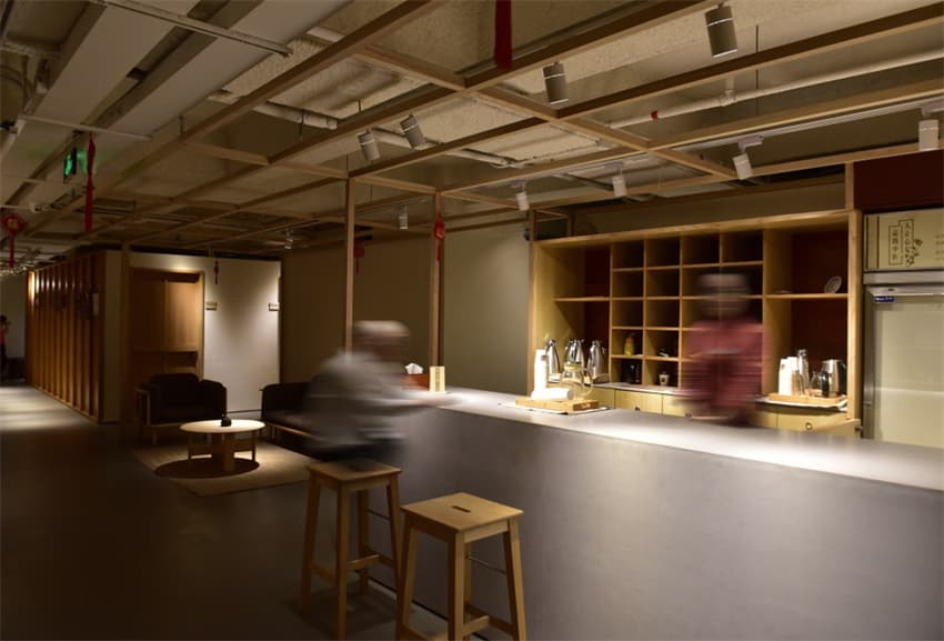 公共客廳的整個(gè)空間通透,不帶有任何鮮明中式符號(hào)化的烙印,“無(wú)”形式、“無(wú)”修辭,顯出開(kāi)放與自由。設(shè)計(jì)師未賦予醫(yī)館任何“風(fēng)格”,悉心選擇材料、構(gòu)件,令其中的一器一物成為主體。并通過(guò)木架的形式統(tǒng)籌起等候、調(diào)劑、收銀、水吧及展示和宣傳等功能區(qū)。此時(shí)自然質(zhì)樸的實(shí)木條在設(shè)計(jì)師眼中有了新的定義,即是劃分、圍合空間的構(gòu)件,也留給使用者未來(lái)宣傳展示、裝飾的一種可能性。