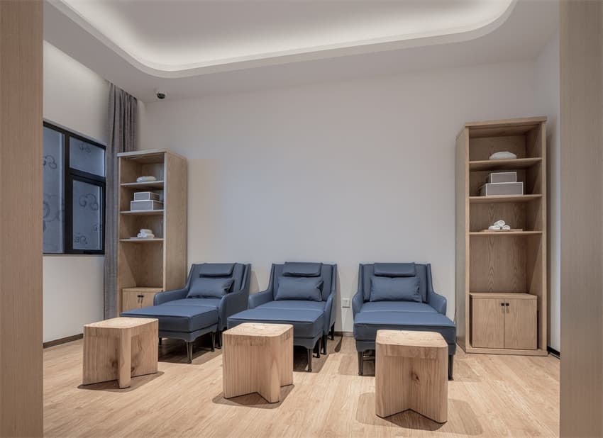 空間整體設計設色上遵循長者的偏好,以樸拙雅致的米色、木藝色搭配年華VI系統(tǒng)色彩的藍色作為點綴,予人靜謐、舒的空間體驗。