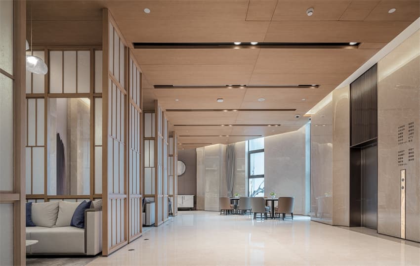 洽談區(qū)延續(xù)柔和的原木色調(diào),以古樸木藝與通透紙質(zhì)的搭配,圍合出靜雅有序的洽談場域。設計透過藝術語匯詮釋材質(zhì)、色澤、幾何形制等調(diào)性,營造對話與碰撞,賦予空間人文藝術的溫度與創(chuàng)新格調(diào)。