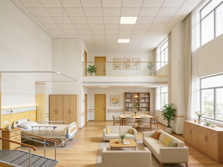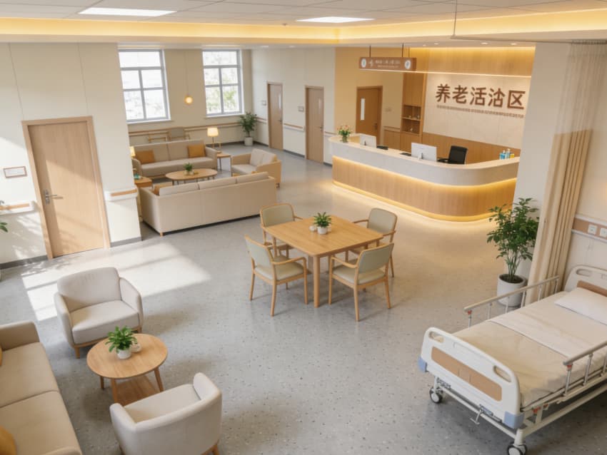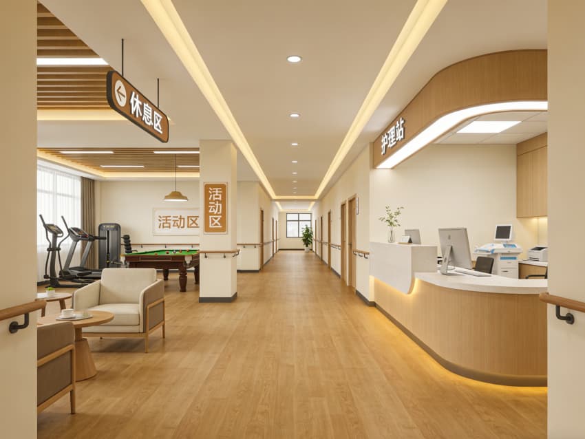 照護(hù)核心區(qū):護(hù)理站采用開放式設(shè)計(jì),便于醫(yī)護(hù)人員隨時(shí)觀察長者狀態(tài),走廊加裝防滑扶手與感應(yīng)夜燈,地面選用防滑耐磨的塑膠材質(zhì),保障行走安全;康養(yǎng)居室融合病床與居家家具,預(yù)留護(hù)理操作空間,同時(shí)配備緊急呼叫系統(tǒng),兼顧照護(hù)專業(yè)性與生活舒適度。