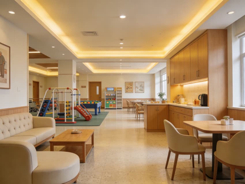 休閑社交區(qū):設(shè)置活動區(qū)、棋牌室與親子互動空間,適配長者的社交與娛樂需求;開放式餐廚區(qū)配備適老化餐桌與餐具,既滿足集體用餐,也支持家庭小聚,讓長者在互動中感受生活樂趣。
