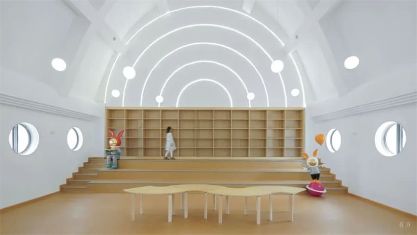 在一系列不同尺度和背景下,獨特的立面設(shè)計很好地詮釋了內(nèi)部和外部空間之間的過渡與邊界。大廳以面積的落地窗開放視野,將自然包容進(jìn)教學(xué)空間里,自然舒適地澆灌每一粒好奇的種子。在飛船艙體一般的獨立拱頂建筑中,孩子們手中的繪本又將打開探索者穿梭星際空間的序章。