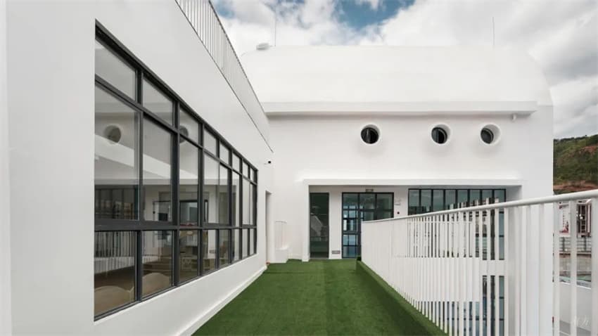 主體建筑物以純白作為主色,在周圍青灰色調(diào)的建筑中脫穎而出,新與舊相映成趣,體現(xiàn)了城市積極的更新關(guān)系,也增添了一份不被世俗捆綁的自由,天空、綠植的本色成為主要的點綴色,孩子們在其中穿行奔跑,抵達(dá)山野林間,也是抵達(dá)理想的未來。