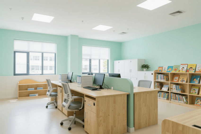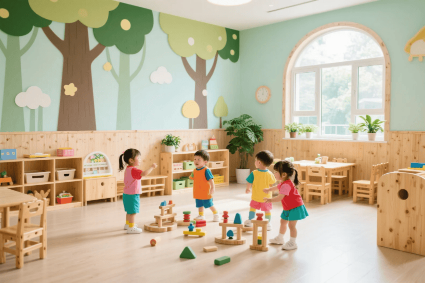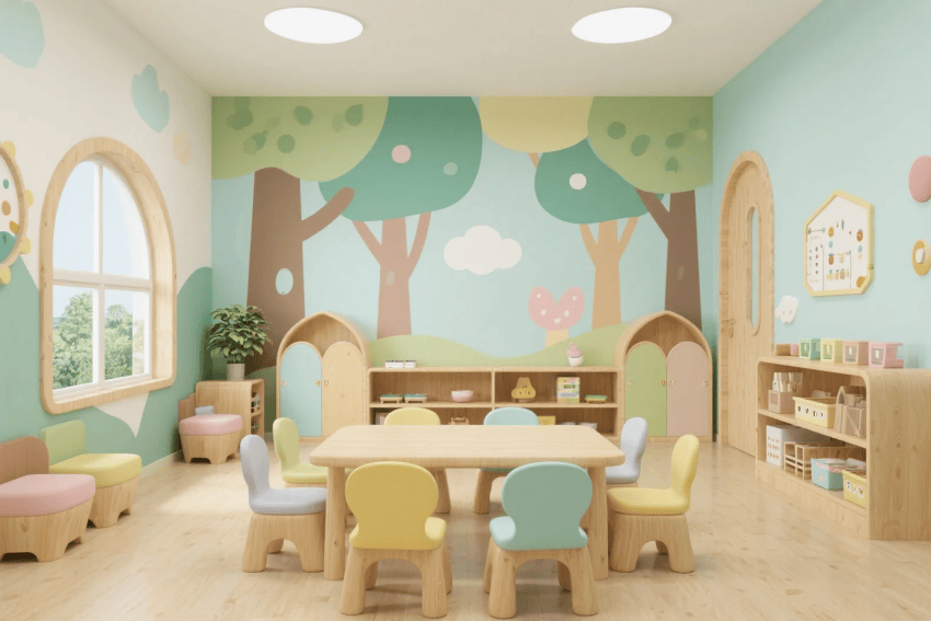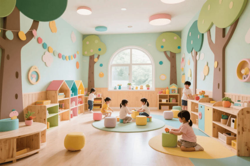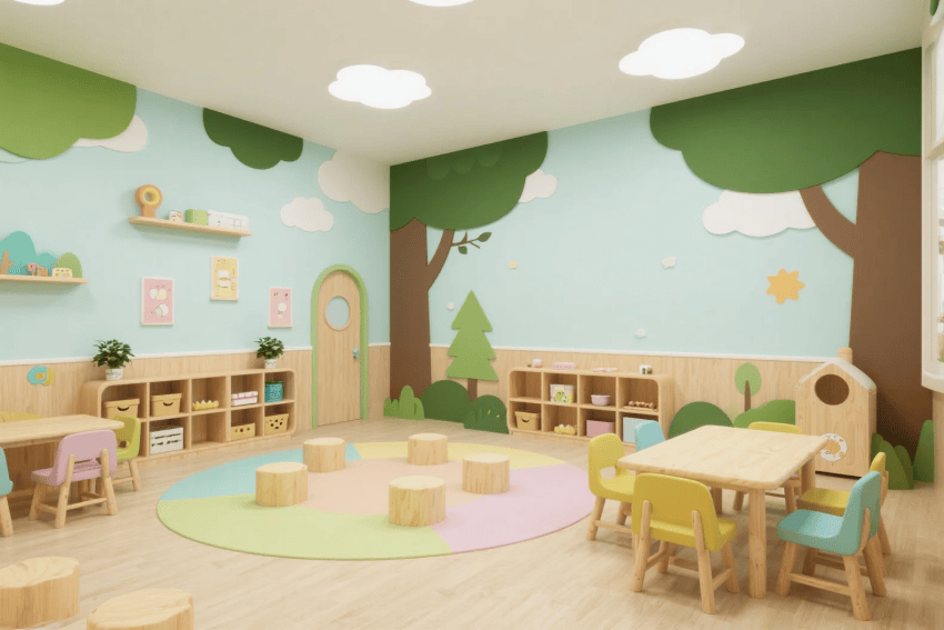 每個班級設(shè)置主題沉浸區(qū),通過墻面彩繪、定制教具等激發(fā)想象力。戶外區(qū)域融合自然教育理念,設(shè)置感官路徑、迷你菜園等互動設(shè)施。智能細(xì)節(jié)包括空氣監(jiān)測顯示、防夾手門設(shè)計等,在童趣設(shè)計中暗藏安全保障,最終呈現(xiàn)一個"可探索、可互動、可成長"的理想幼兒園。