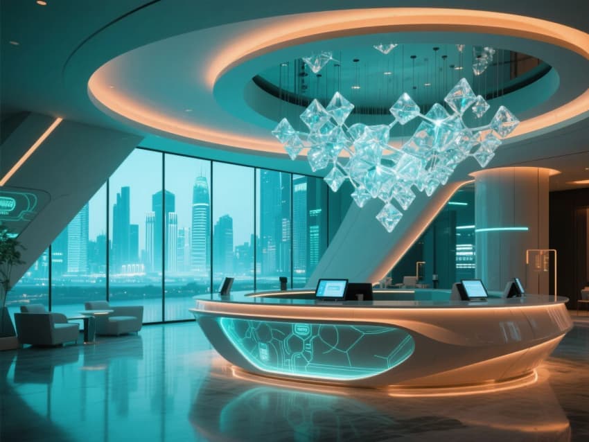 這座未來(lái)主義酒店大堂宛如一座懸浮于時(shí)空夾縫中的水晶宮殿。智能玻璃幕墻如同會(huì)呼吸的肌膚,將整座城市的天際線化作流動(dòng)的畫卷,在透明與朦朧間交替變幻。懸浮式環(huán)形接待臺(tái)似銀河般緩緩旋轉(zhuǎn),全息登記系統(tǒng)投射出的數(shù)據(jù)流如同星辰閃爍,在空氣中勾勒出優(yōu)雅的光痕。
