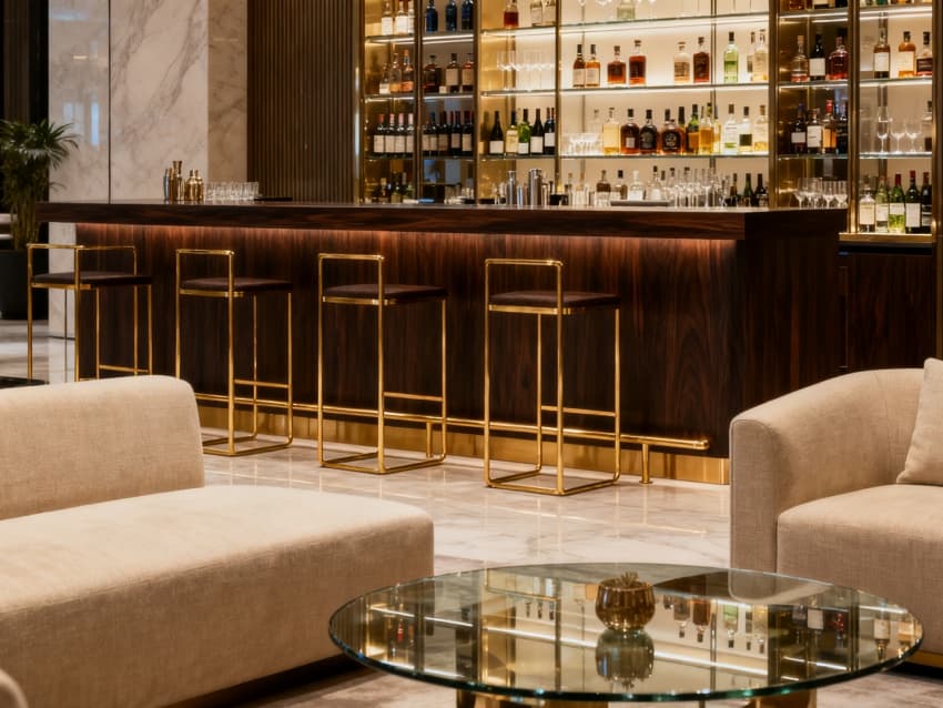 里面的設計和外面呼應得很好:大堂地面是亮堂堂的米白大理石,接待臺是深棕色木頭做的,頂上掛著金屬質感的燈,看著就高級;客房里是淺灰的床品、米白的墻面,配著深棕色的衣柜,住著很溫馨;餐廳用淺金色細隔斷分區(qū)域,桌子是白色、椅子是灰色,吃飯時不擁擠還顯整潔;休閑區(qū)放著淺灰沙發(fā)、玻璃茶幾,擺幾盆小綠植,坐著歇著很愜意;走廊鋪淺灰地毯、墻面刷米白,壁燈是暖光,晚上走著不冷清。整個酒店看著干凈精致,住得也舒服。
